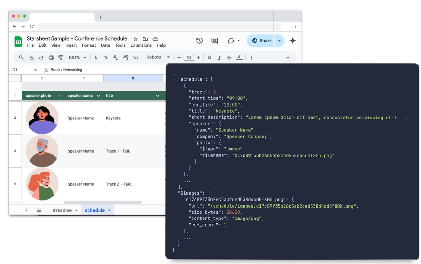 View our sample project which uses Starsheet to publish a online conference schedule with no backend and a few lines of Javascript.